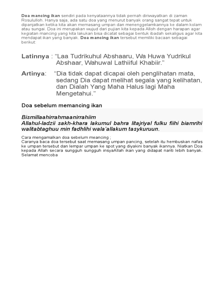 Doa untuk mancing ikan di kolam. Arti terjemahan doa nabi khidir untuk memancing ikan. Doa mancing ikan mendapatkan ikan yang banyak adalah tujuan utama seseorang berangkat memancing. Bukan hanya itu doa ini juga bisa digunakan untuk memancing beberapa jenis ikan seperti ikan lele mujair atau ikan mas. Dengan nama allah apa yang dikehendaki allah tiada yang dapat menjauhkan kejahatan kecuali allah.